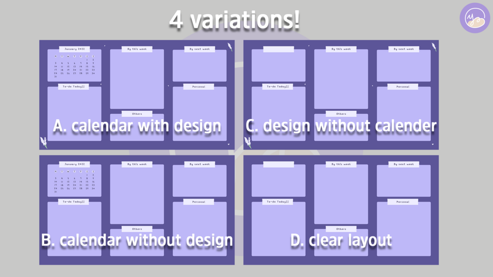 60+ cheerful, clean and minimalist desktop organizers with calendar, to-do today, by this week, by next week, personal and others (total of 6 sections) to keep up with deadlines and increase your productivity. Get your clean and organized desktop now!